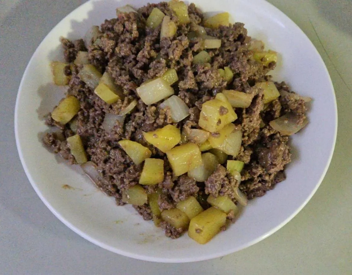 * 加免治牛肉,與洋蔥一齊炒熟,上碟。